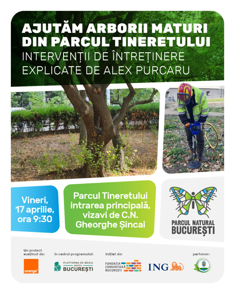 Asociația Parcul Natural Văcărești organizează vineri, 17 aprilie 2026, începând cu ora 9:30, un atelier dedicat stării arborilor maturi din Parcul Tineretului și măsurilor care pot fi luate pentru recuperarea lor. Întâlnirea va avea loc la intrarea principală a parcului, vizavi de C.N. Gheorghe Șincai, iar participarea este gratuită.