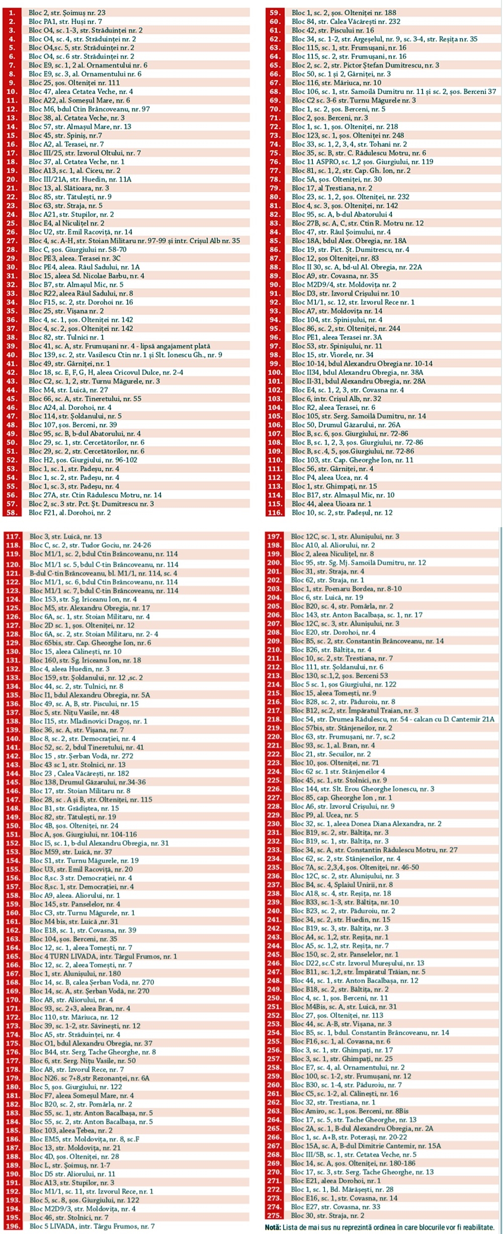 Fara alte comentarii, va prezentam lista cu cele 275 de blocuri unde se va putea incepe reabilitarea: