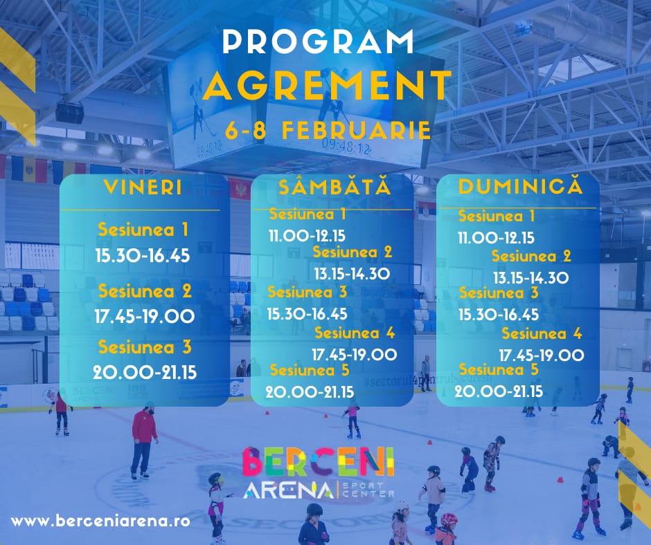 Sâmbăta și duminica, 7-8 februarie, sesiunile de patinaj vor avea loc la orele 11:00 – 12:15, 13:15 – 14:30, 15:30 – 16:45, 17:45 – 19:00 și 20:00 – 21:15, oferind opțiuni flexibile pentru familii, grupuri de prieteni sau pasionați individuali.