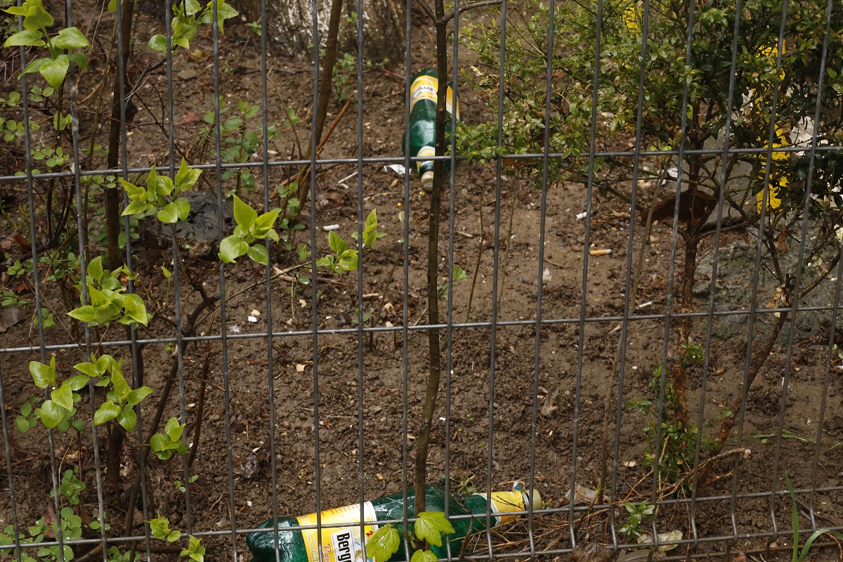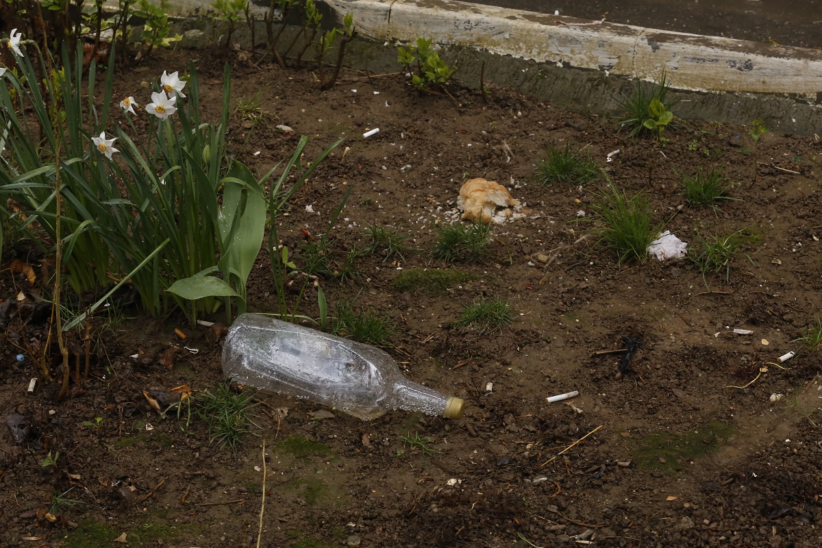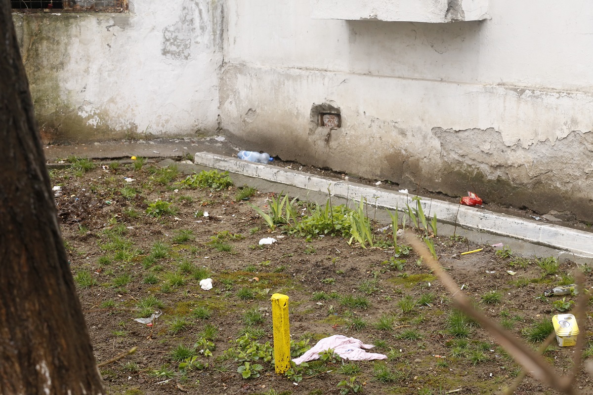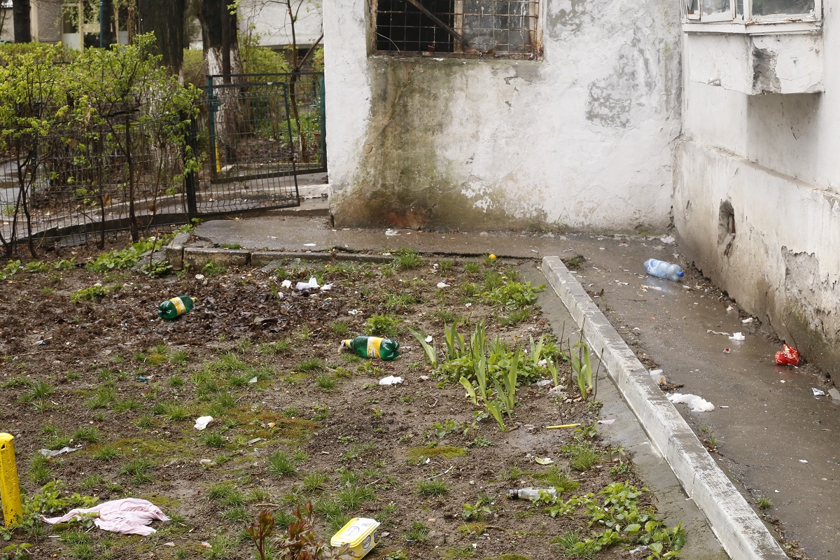 La numai cativa metri distanta, peisajul a inceput sa ne dea fiori. Gradina din spatele blocului, plina si ea cu iarba si flori, era asezonata cu pet-uri, cutii goale de margarina, saci menajeri plini cu gunoi, resturi alimentare, casolete, sticle goale de alcool, parti de lenjerie, paine. Unele gunoaie nu au mai reusit sa parcurga drumul de la etajele superioare ale blocului pana jos, asa ca au ramas agatate in copaci. Astfel, in cei trei plopi am putut vedea agatate pet-uri de 2 l si 5 l, saci cu gunoi, lenjerie intima si muulte altele.