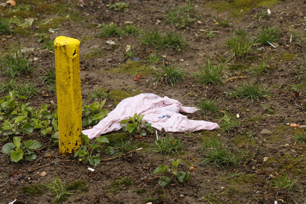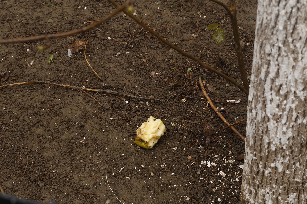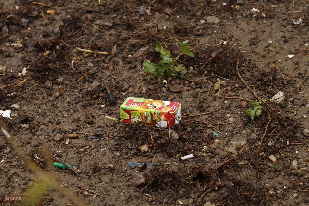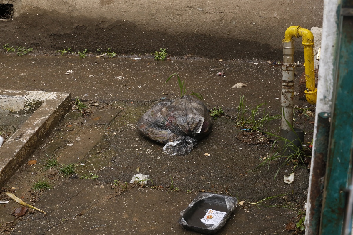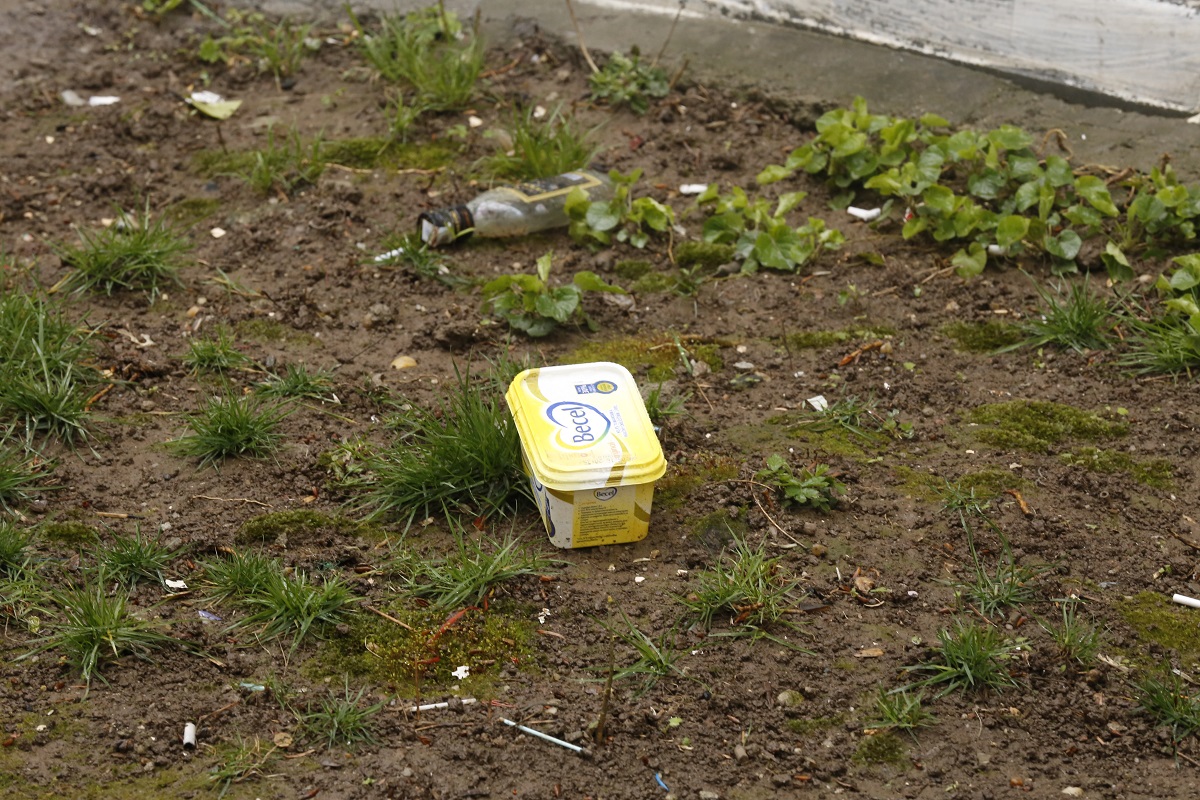 La numai cativa metri distanta, peisajul a inceput sa ne dea fiori. Gradina din spatele blocului, plina si ea cu iarba si flori, era asezonata cu pet-uri, cutii goale de margarina, saci menajeri plini cu gunoi, resturi alimentare, casolete, sticle goale de alcool, parti de lenjerie, paine. Unele gunoaie nu au mai reusit sa parcurga drumul de la etajele superioare ale blocului pana jos, asa ca au ramas agatate in copaci. Astfel, in cei trei plopi am putut vedea agatate pet-uri de 2 l si 5 l, saci cu gunoi, lenjerie intima si muulte altele.
