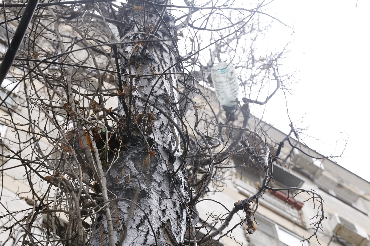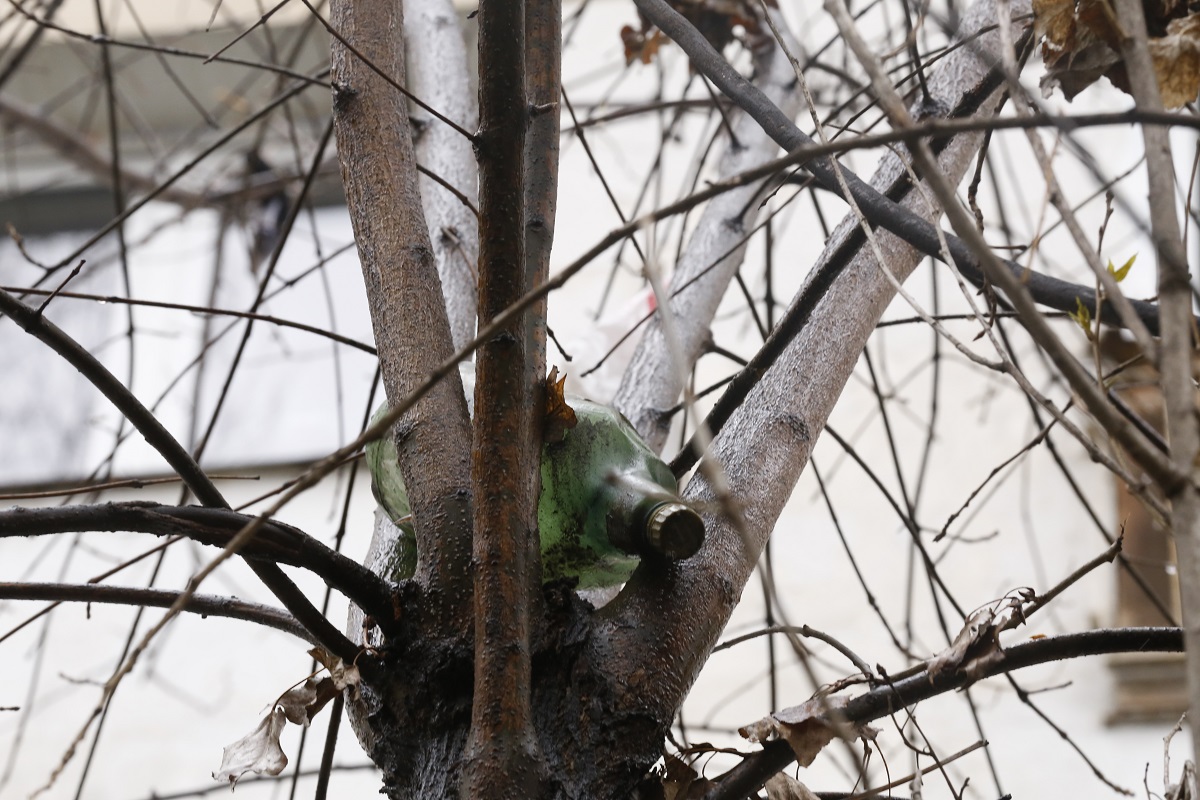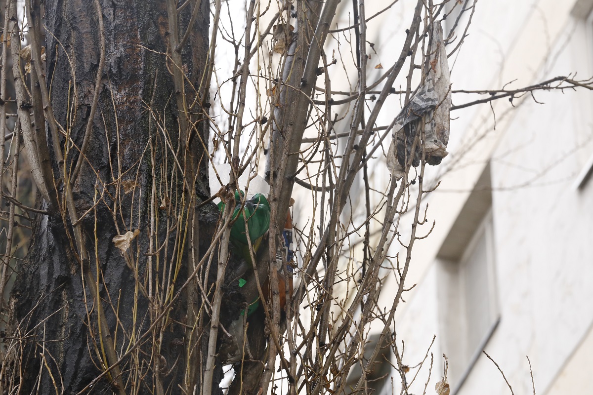 Aspectul acestei gradini este dezolant. Faptul ca deseurile se afla in copaci, la distante diferite si pe jos, imprastiate in toata gradina, ne-a facut sa credem ca in blocul respectiv domneste o lege nescrisa: gunoiul se arunca pe fereastra, nu la ghena!
