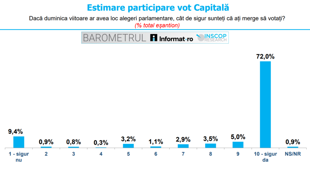 Fără alte comentarii, vă prezentăm Sondajul realizat de INSCOP Research la comanda Informat.ro − Datele au fost culese în perioada 17-19 noiembrie 2025 prin metoda CATI (interviuri telefonice), volumul eșantionului simplu, stratificat fiind de 1107 de persoane, reprezentativ pe categoriile socio-demografice semnificative (sex, vârstă, ocupație) pentru populația neinstituționalizată a Municipiului București, cu vârsta de 18 ani și peste. Eroarea maximă admisă a datelor este de ± 2.95%, la un grad de încredere de 95%.