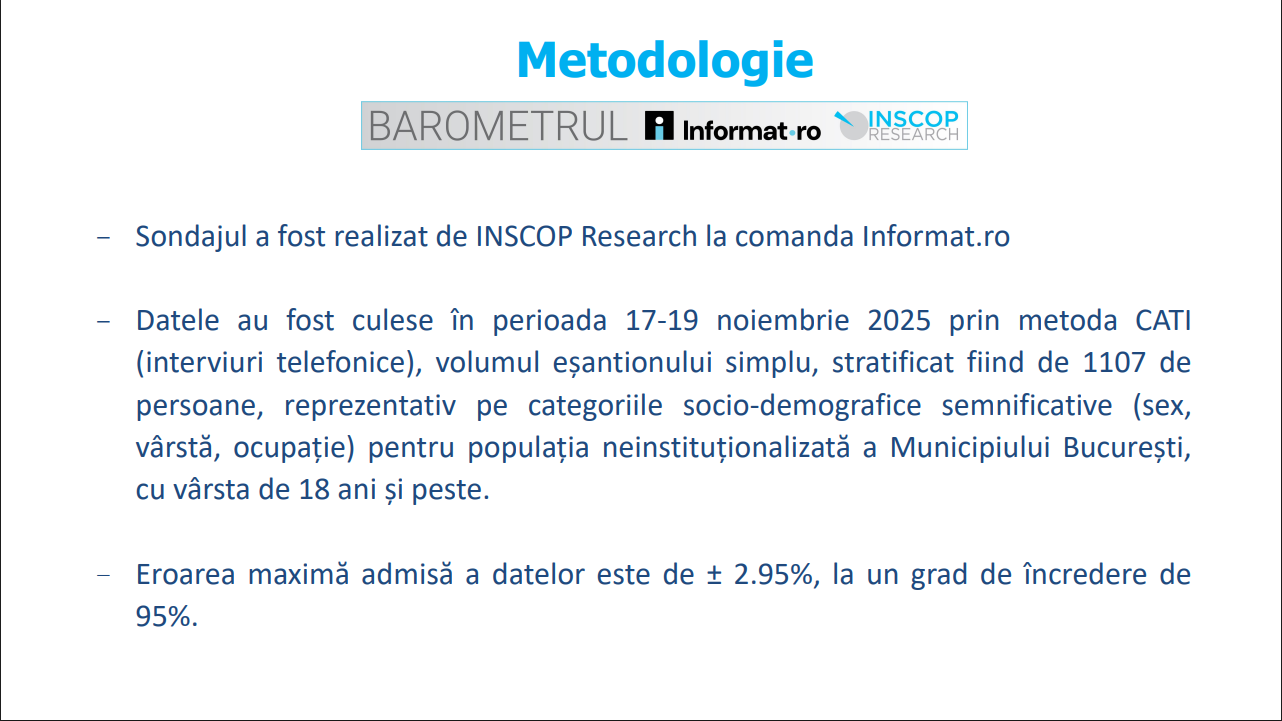 Fără alte comentarii, vă prezentăm Sondajul realizat de INSCOP Research la comanda Informat.ro − Datele au fost culese în perioada 17-19 noiembrie 2025 prin metoda CATI (interviuri telefonice), volumul eșantionului simplu, stratificat fiind de 1107 de persoane, reprezentativ pe categoriile socio-demografice semnificative (sex, vârstă, ocupație) pentru populația neinstituționalizată a Municipiului București, cu vârsta de 18 ani și peste. Eroarea maximă admisă a datelor este de ± 2.95%, la un grad de încredere de 95%.
